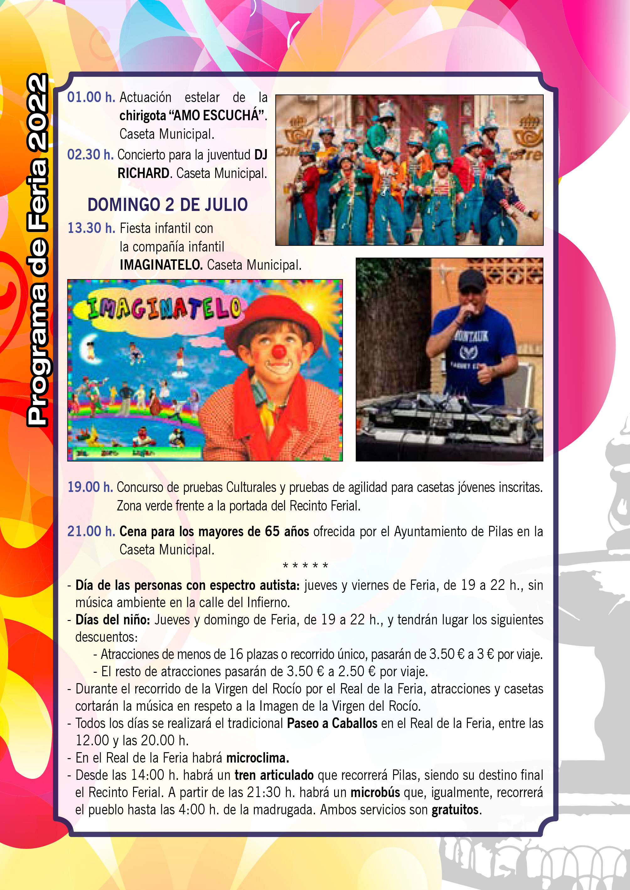 Nuevamente este año, el Ayuntamiento pone en marcha un servicio gratuito de tren y microbús para el desplazamiento hasta el Real, así como los Días de las Personas con espectro autista (jueves y viernes de Feria, de 19 a 22 h.), sin música ambiente en la calle del Infierno, y los Días del Niño, que serán jueves y domingo de Feria, de 19 a 22 h., y tendrán lugar los siguientes descuentos:
