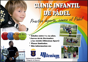 El Clinic Infantil de Pádel comenzará el próximo jueves, 29 de noviembre a las 16.00 horas en el Gimnasio Milenuim Sport. Se trata de un convenio entre dicho gimnasio y la Delegación de Deportes al objeto de que aquellos niños y niñas que estén interesados en recibir clases de iniciación al pádel puedan hacerlo en dichas instalaciones a un precio asequible.