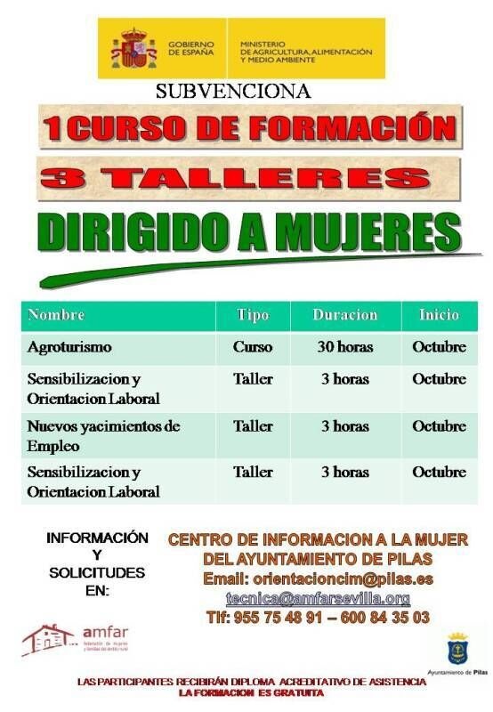 Organizados por AMFAR en colaboración con el Ayuntamiento de Pilas. Información y solicitudes en el Centro de Información a la Mujer, en los emails orientacioncim@pilas.es / tecnica@amfarsevilla.org o en los teléfonos 955 75 48 91 / 600 84 35 03.