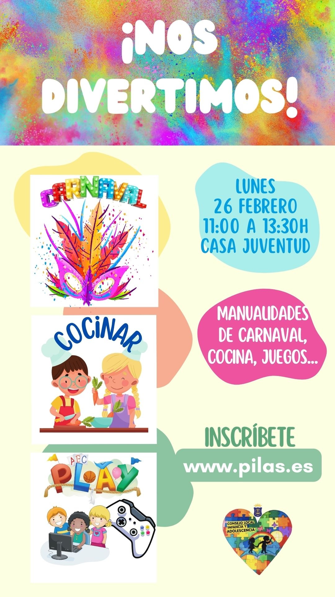 Talleres rotatorios en la Casa de la Juventud. Día 26 de febrero desde las 11:00 h hasta la 13:30 h. Elegidos por los componentes del Consejo Local de Infancia y Adolescencia: Manualidades, carnaval, cocina, informática, Play Station, juegos...