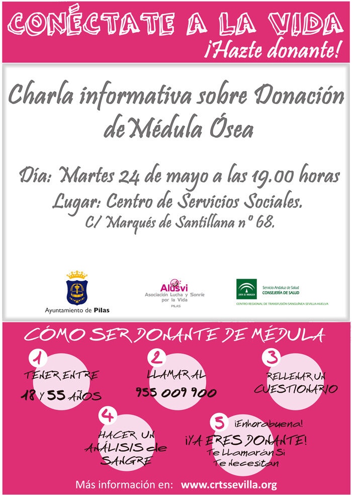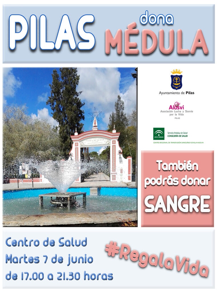 Tras la charla informativa del pasado día 24 de mayo, organizada por la delegación de Sanidad del Ayuntamiento, en colaboración con Alusvi y el Centro de Transfusión Sanguínea, ahora tienes la oportunidad de HACERTE DONANTE de médula en el Centro de Salud Pilas el próximo 7 de junio de 17.00 a 21.30 horas. Además, las personas interesadas podrán realizar una DONACIÓN de SANGRE ordinaria ese mismo día.