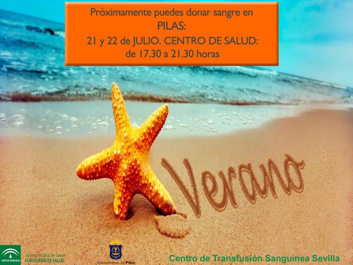 EL JUEVES 21 Y VIERNES 22 DE JULIO habrá una campaña de donación de sangre en PILAS. Será en EL CENTRO DE SALUD en horario de 17.30 a 21.30 horas. Se necesita sangre de todos los grupos sanguíneos.