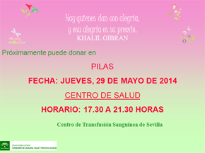 EL JUEVES 29 DE MAYO habrá una campaña de donación de sangre en PILAS. Será en LA CASA DE LA CULTURA en horario de 17.30 a 21.30 horas. Se necesita sangre de todos los grupos sanguíneos. Más información en esta noticia.