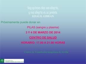 El lunes 3 y el martes 4 de marzo habrá una campaña de donación de sangre y plasma en Pilas. Será en el Centro de Salud en horario de 17.00 a 21.00 horas. Se necesita sangre de todos los grupos sanguíneos, especialmente antes y después de los puentes festivos.
