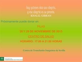EL JUEVES 28 Y VIERNES 29 DE NOVIEMBRE habrá una campaña de donación de sangre en PILAS. Será en EN EL CENTRO DE SALUD en horario de 17.00 a 21.00 horas. Se necesita sangre de todos los grupos sanguíneos.